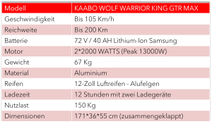 Neue Rakete im Kaabo-Universum; der eScooter Kaabo Wolf Warrior King GTR MAX! Doppelmotoren mit jeweils 2000 Watt (Spitzenleistung 13000W!!), ein noch grosser Samsung entnehmbarer 72V/40Ah-Akku (2520 Wh) für eine Reichweite von bis zu 200 km. Höchstgeschwindigkeit 105 km/h! Einstellbare Federung, 160-mm-Hydraulikscheibenbremsen, Farb-TFT-Bildschirm, 12-Zoll-Reifen, die speziell mit der Firma CST entwickelt wurden.