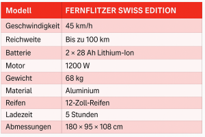Der FernFlitzer SWISS EDITION Elektroroller ist mit zwei Abnehmbaren Lithium-Batterien von jeweils 28Ah (gesamt 56Ah) ausgestattet und bietet eine Reichweite von bis zu 100 km. Sein Bremssystem umfasst hydraulische Scheibenbremsen vorne und hinten für maximale Sicherheit. Darüber hinaus sorgen seine breiten Reifen für aussergewöhnlichen Grip auf allen Strassenbelägen.