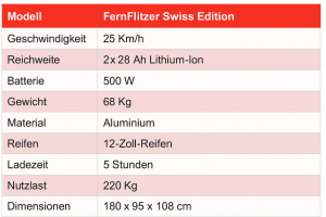 Der FernFlitzer SWISS EDITION Elektroroller ist mit zwei Abnehmbaren Lithium-Batterien von jeweils 28Ah (gesamt 56Ah) ausgestattet und bietet eine Reichweite von bis zu 100 km. Sein Bremssystem umfasst hydraulische Scheibenbremsen vorne und hinten für maximale Sicherheit. Darüber hinaus sorgen seine breiten Reifen für aussergewöhnlichen Grip auf allen Strassenbelägen.