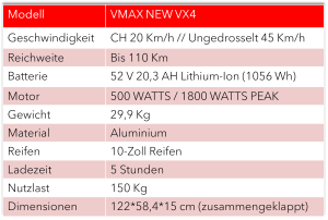 Der brandneue Elektro scooter VMAX VX2 PRO LT-B der Schweizer Marke VMAX ist ab sofort erhältlich! Der Elektro scooter VMAX VX2 PRO LT-B ist mit einem 48 V / 10,4 Ah (500 Wh) Lithium-Ionen-Akku für eine Reichweite von bis zu 35 km ausgestattet. Aufblasbare 10 Zoll-Reifen, 500 Watt Motorleistung, Farbdisplay mit allen Informationen während der Fahrt. Die maximale Belastung sollte 130 kg nicht überschreiten. Jetzt auch als Version ST-B mit 13 Ah Akku für eine Reichweite von bis zu 45 Km erhältlich.