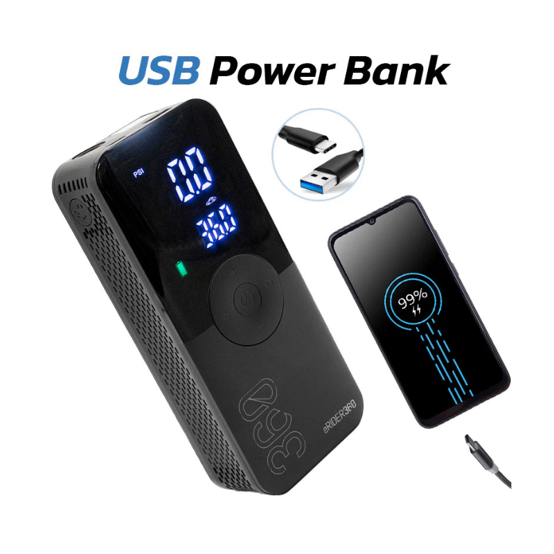In addition to its inflating function, the eRider360 also works as a USB power bank, allowing you to charge your smartphone or other electronic devices on the go.