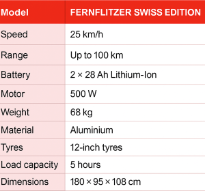 The FernFlitzer SWISS EDITION electric scooter is equipped with two removable lithium batteries of 28Ah each (total 58Ah), providing a range of up to 100 km. Its braking system includes hydraulic disc brakes at the front and rear for optimal safety. Additionally, its wide tires ensure exceptional grip on all types of roads.