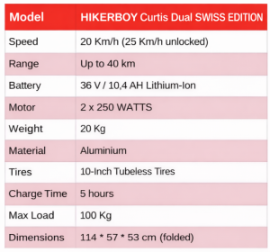 A rising star in urban mobility: the HIKERBOY Curtis Dual PRO. Equipped with dual motors delivering a combined peak power of 1000W, this e-scooter offers strong acceleration and confidently handles climbs of up to 25%. Powered by a high-performance lithium battery, it provides a range of up to 40 km. The speed is limited to 20 km/h in compliance with Swiss regulations, while the top speed reaches up to 35 km/h. What makes the PRO version stand out is its two mechanical disc brakes, offering enhanced braking performance and extra rider confidence. Compatible with the HIKERBOY app, it combines smart connectivity with everyday practicality. With its compact frame and modern design, the HIKERBOY Curtis Dual PRO is the perfect companion for comfortable, safe and stylish urban commuting. An unlocked, non-road-legal version is also available.